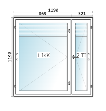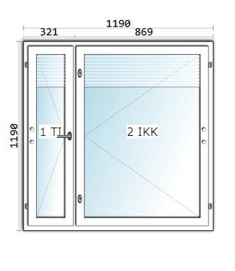 Ikkunan koko on 1190×1190 mm. Tuuletusikkunan leveys on 321 mm.