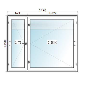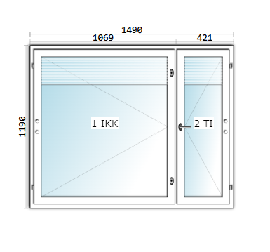 Ikkunan koko on 1490×1190 mm. Tuuletusikkunan leveys on 421 mm.