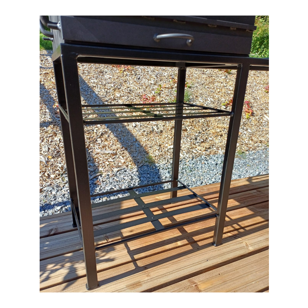 Hyllyille voi laittaa vaikkapa polttopuita tai muuta tarpeellista kokkauksessa tarvittavia tavaroita. Grilliosan alla on laatikko. Hillos ulkotulisijan grilliosa on erikseen irroitettavissa.
