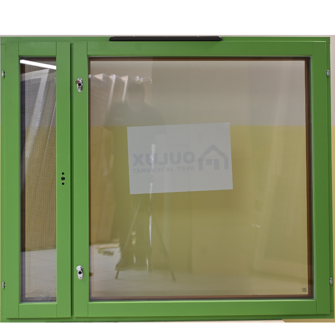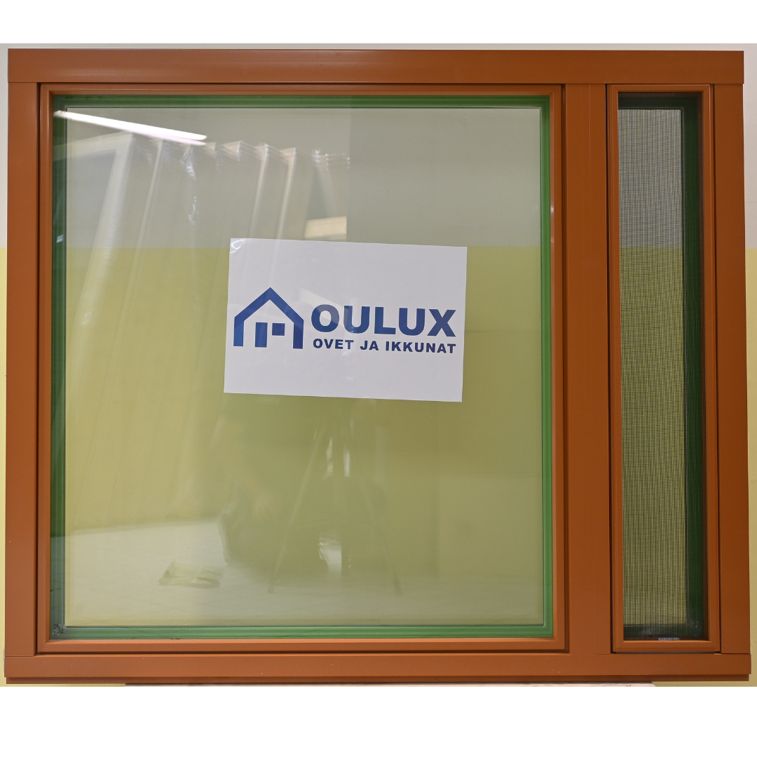 Ouluxin valmistama avattava ikkuna tuuletusikkunalla. Ulkopuoli oranssinruskea, sisäpuoli vihreä.
