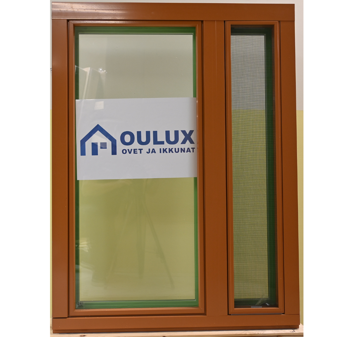 Ouluxin valmistama avattava ikkuna tuuletusikkunalla. Ulkopuoli oranssinruskea, sisäpuoli vihreä.