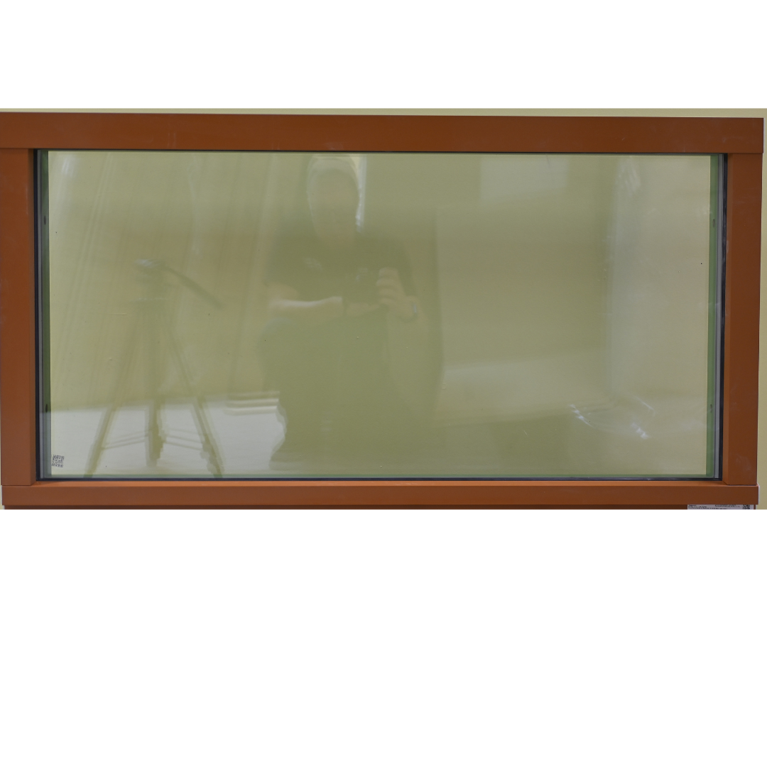 Ouluxin valmistama kiinteä ikkuna. Ulkopuoli oranssinruskea, sisäpuoli vihreä.