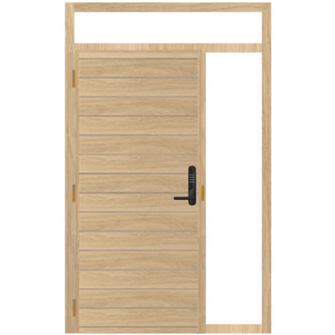 Kotimaisen Puustamon valmistamaan IO3-sisäänkäyntielementtiin kuuluu ulko-oven lisäksi yläikkuna sekä yksi sivuikkuna valitulle puolelle ovea. Sisäänkäyntielementissä ikkunat ja ovilehti ovat samassa karmissa. Yhteen karmiin valmistetuilla ovi-ikkuna kokonaisuuksilla saadaan selkeyttä, siroa ulkonäköä sekä enemmän lasipinta-alaa. Elementin puuosien valmistusmateriaali on oksaton mänty.