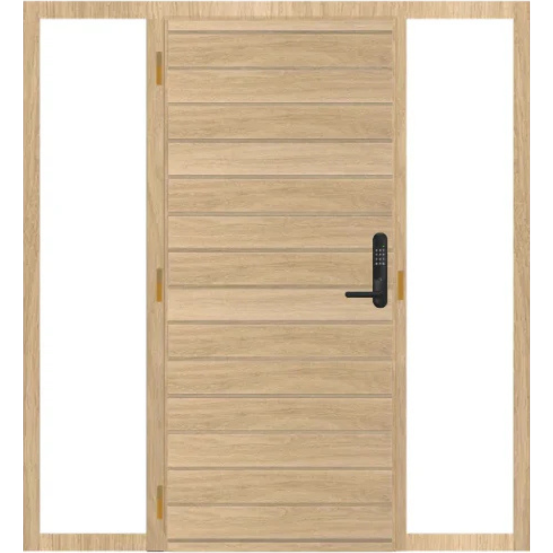 Kotimaisen Puustamon valmistamaan IO4-sisäänkäyntielementtiin kuuluu ulko-oven lisäksi sivuikkunat oven molemmille puolille. Sisäänkäyntielementissä ikkunat ja ovilehti ovat samassa karmissa. Yhteen karmiin valmistetuilla ovi-ikkuna kokonaisuuksilla saadaan selkeyttä, siroa ulkonäköä sekä enemmän lasipinta-alaa. Elementin puuosien valmistusmateriaali on oksaton mänty.