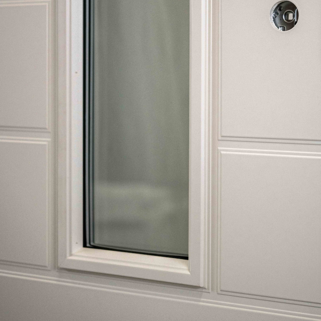Eturakenteen ovessa on yksi tiiviste ja kaksinkertainen lämpölasi. Jos haluat tuplatiivistetyn oven, tutustu vakiorakenteen tai thermo-rakenteen oviin.